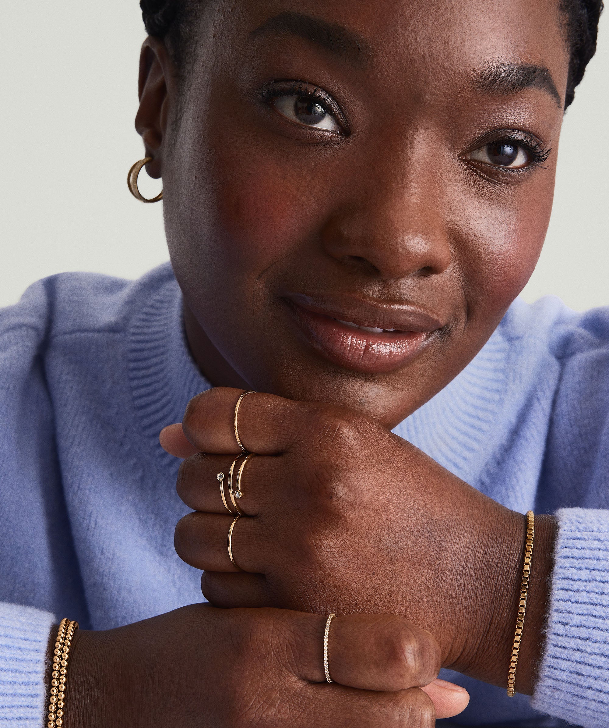Our 14k gold pieces are made to last and perfect for everyday wear. Each piece is crafted from 94% recycled gold. 14k white gold pieces are finished with rhodium plating, giving them their signature color along with added shine and durability.