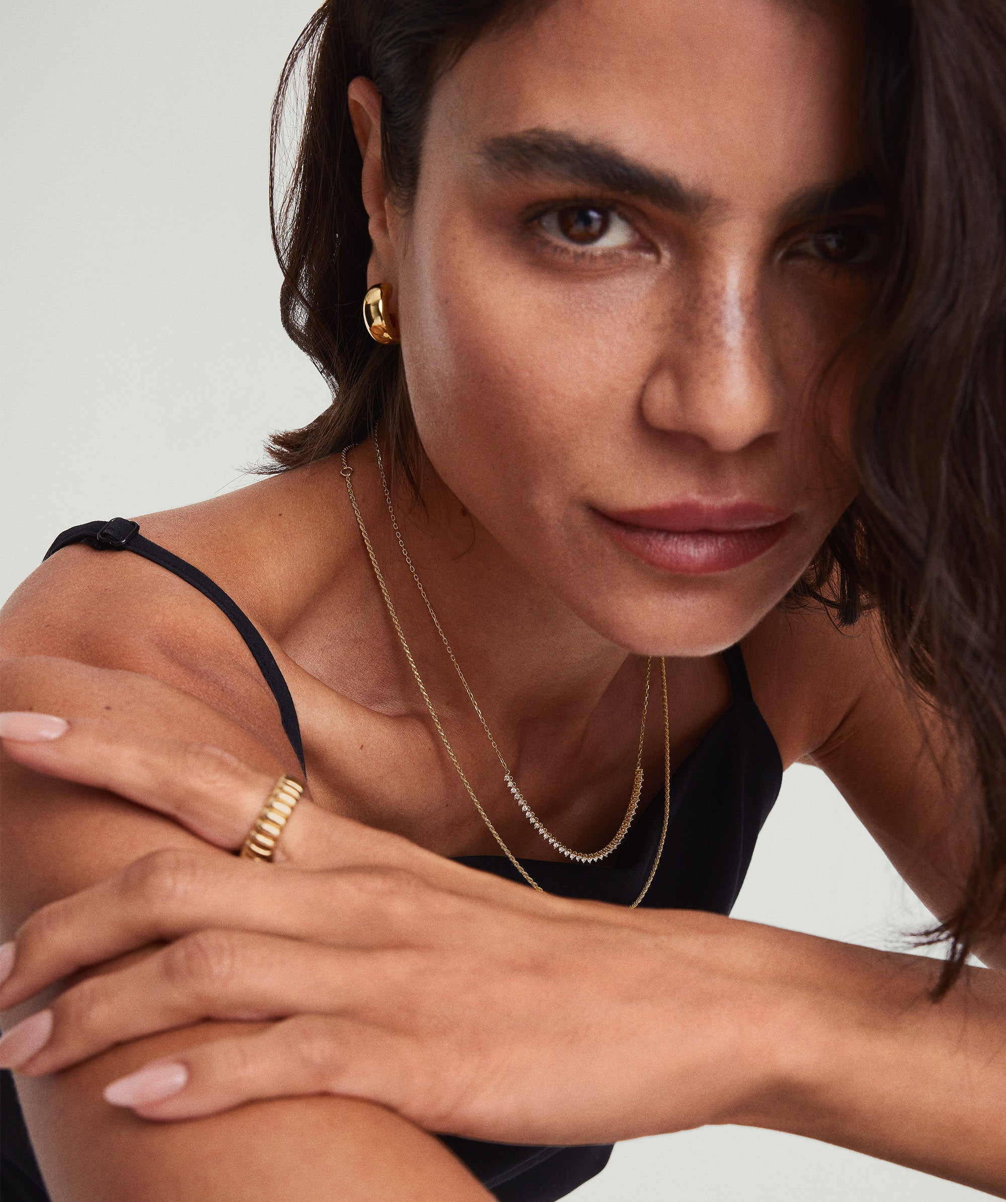 Our 14k gold pieces are made to last and perfect for everyday wear. Each piece is crafted from 94% recycled gold. 14k white gold pieces are finished with rhodium plating, giving them their signature color along with added shine and durability.