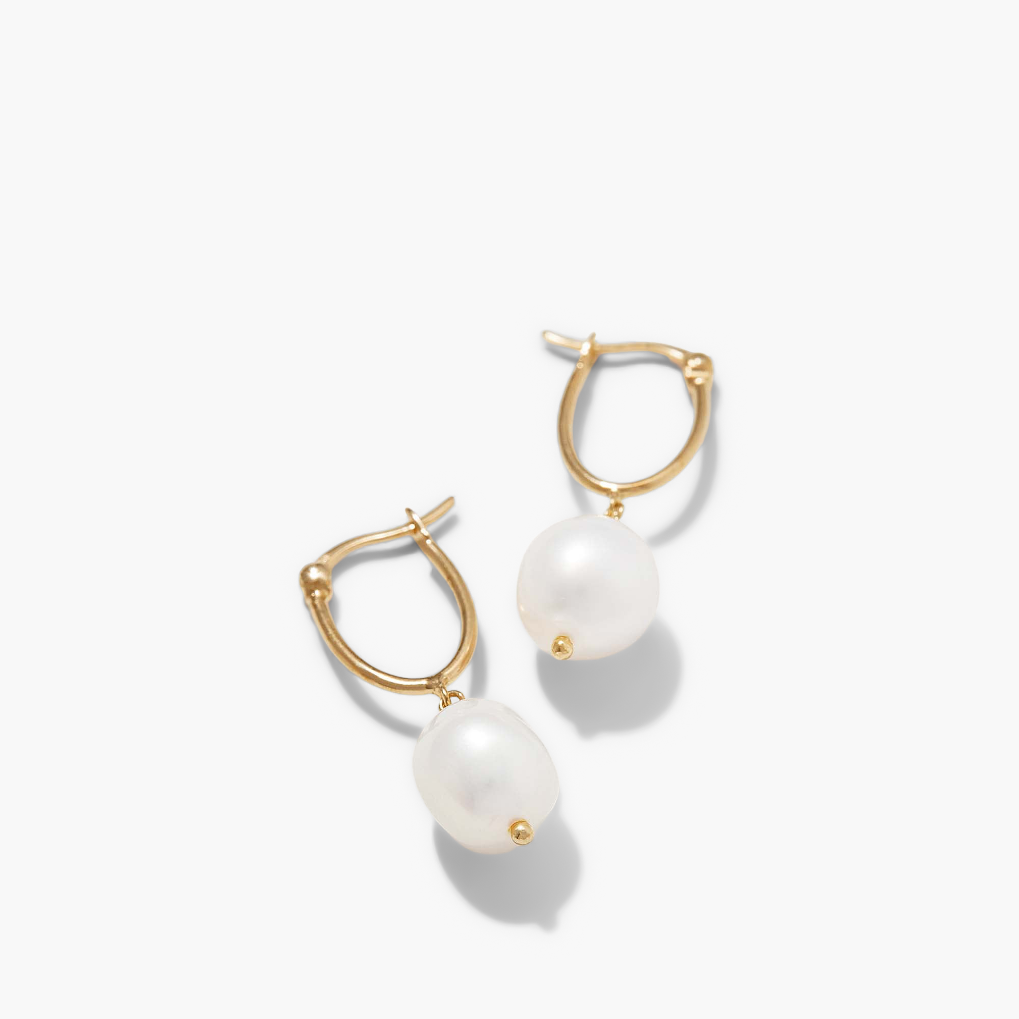 The perfect minimal statement. Mejuri’s 18k Gold Vermeil Handcrafted Organic Pearl Hoop Earrings feature a thick gold layer on sterling silver with a freshwater pearl. Each pearl is handpicked and completely unique, showcasing the natural beauty of pearls.