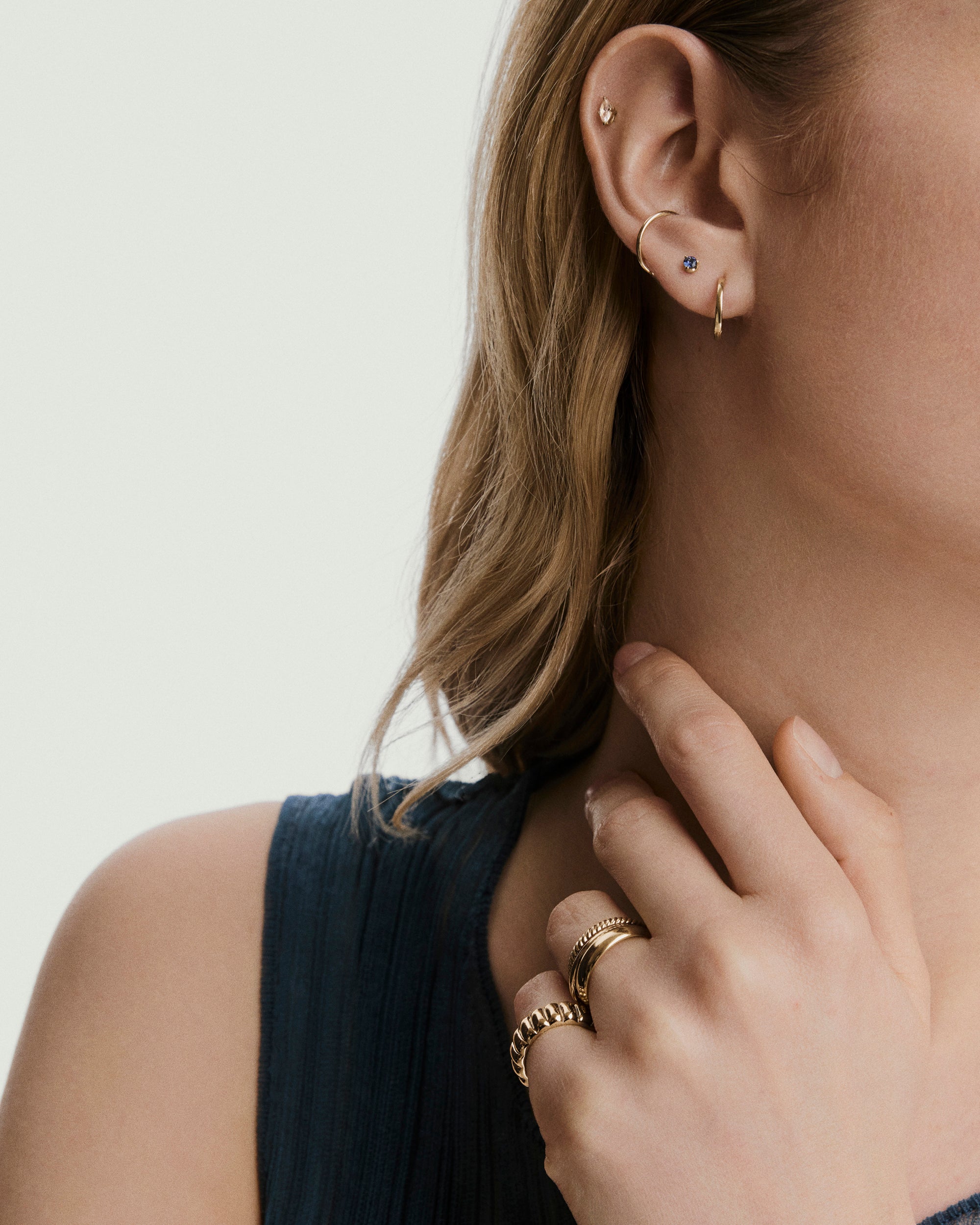 Studs in every color. The more stacked, the better. Pick your birthstone, your favorite person’s, or just a color you like.