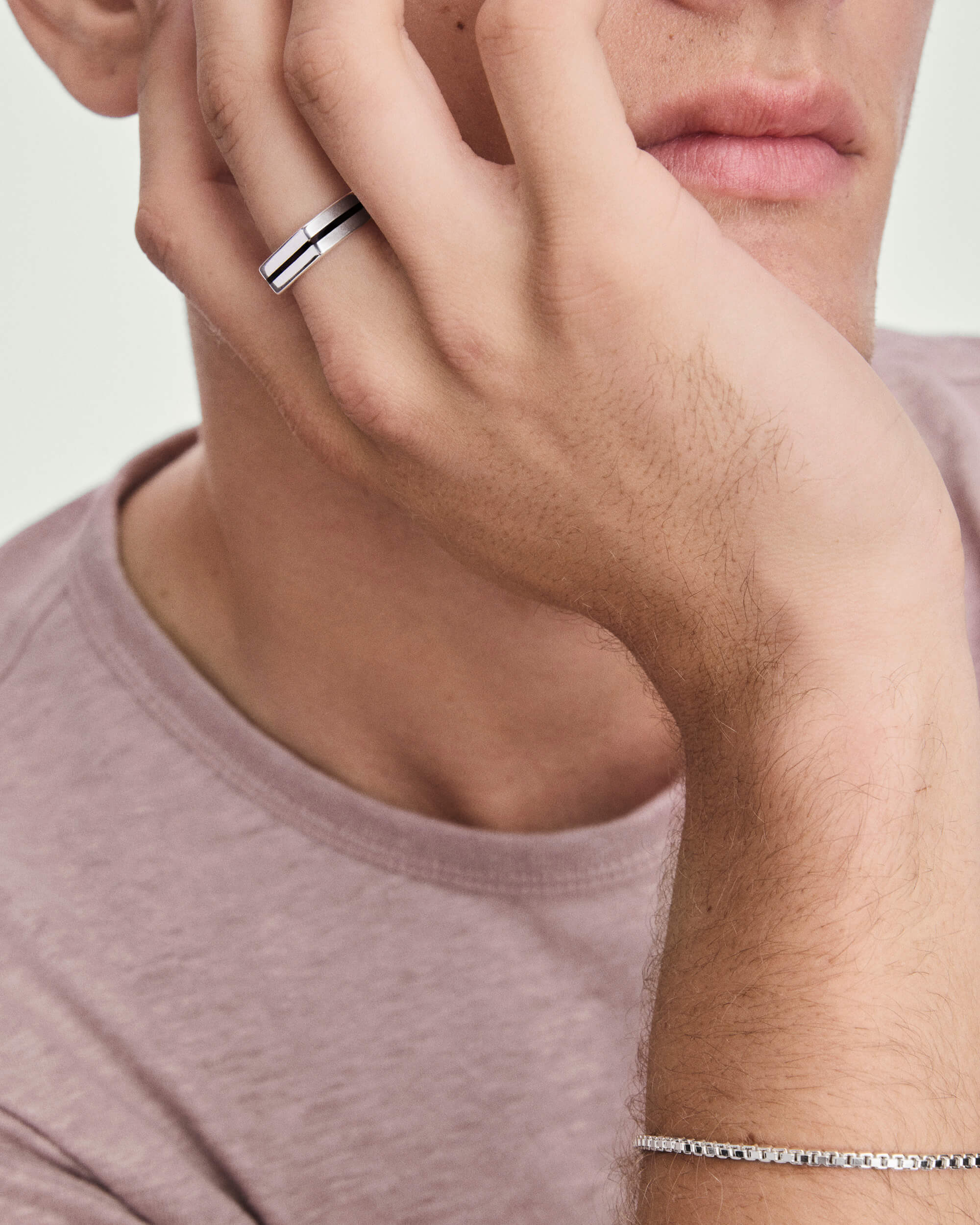 Minimalism with magnitude. A slim silver signet with a black enamel stripe. Sleek contrast with no excess.