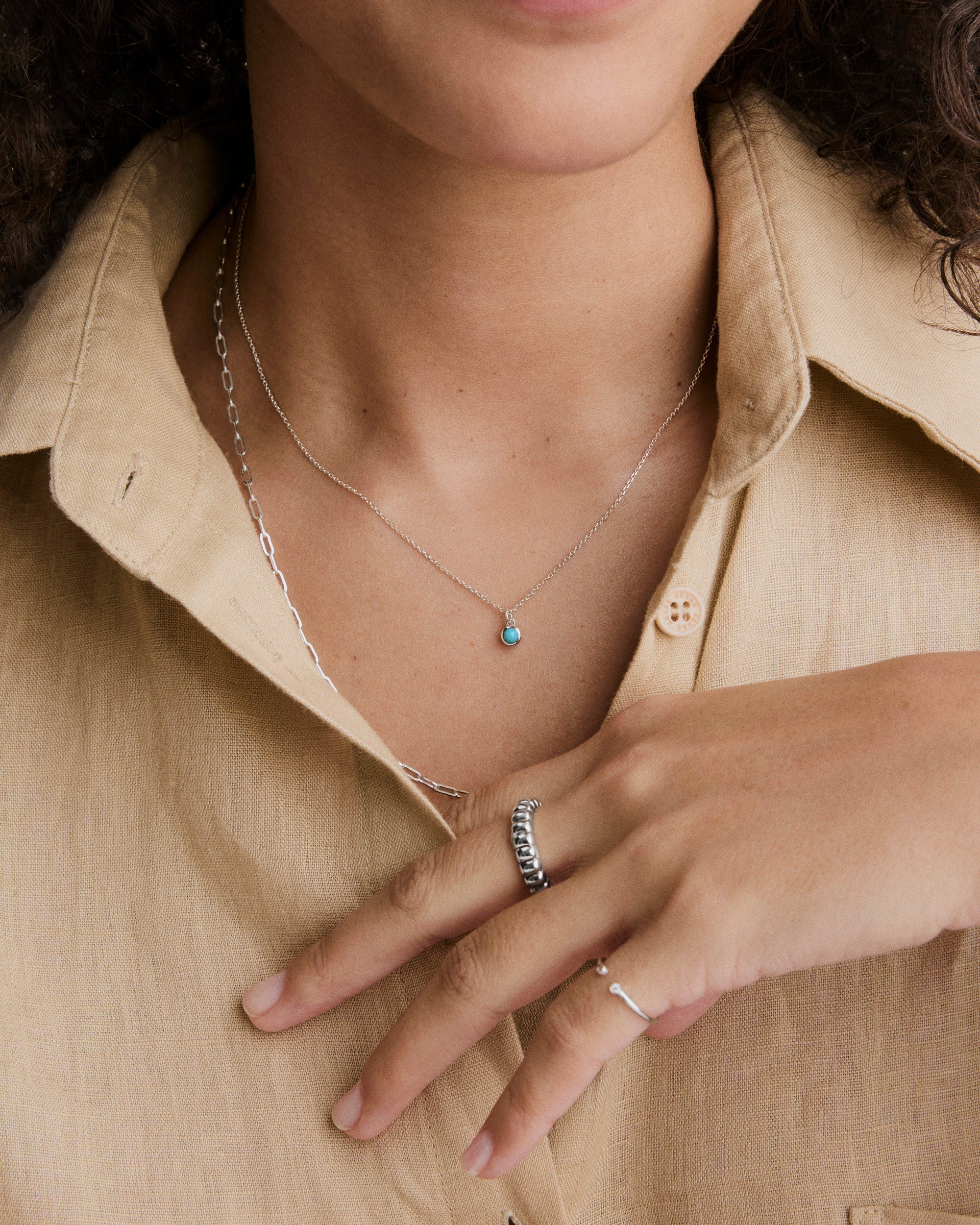 A mini gemstone on a delicate chain, the Sia Pendant Necklace is a favorite for layering with everything. The vibrant stone picks up the light and can be dressed up for dinner or down for the beach—it’s the easiest final touch.